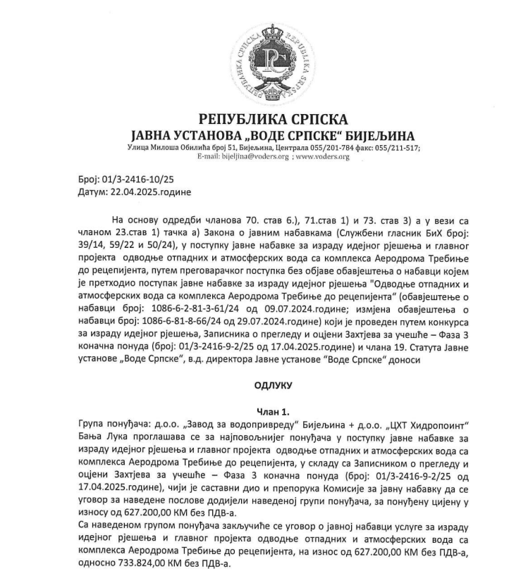 Tako je javno preduzeće „Vode Srpske“ firmama „Zavod za vodoprivredu“ Bijeljina i „CHT Hidropoint“ iz Banjaluke dalo posao vrijedan 733.824 KM koji se odnosi na odvođenje voda.