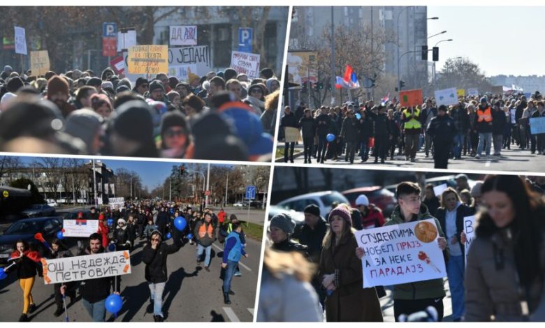 Studenti sa Filozofskog fakulteta okupili su se ispred Rektorata, odakle su se uputili ka Novom Beogradu, kako bi podržali akciju "Novi Beograd šeta za prosvetu" i blokadu kružnog toka kod zgrade opštine, koja počinje u 13 časova.