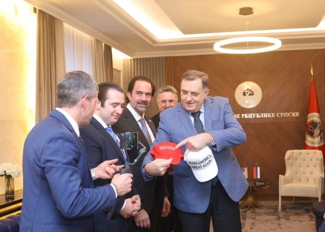 Dodik je sa Đulijanijevim saradnicima, koji su doputovali iz Amerike, razmijenio kačkete. Predsjedniku Srpske su poklonjeni MAGA kačketi /Napravimo Ameriku ponovo velikom/, a on je poklonio kačket na kojem piše "Napravimo Srpsku ponovo velikom".