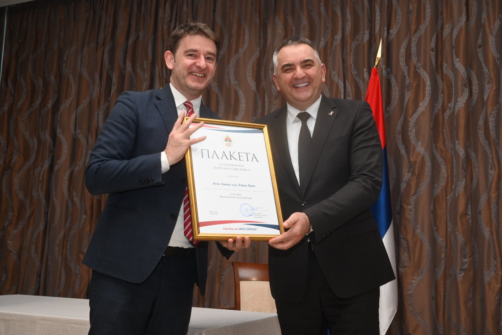 U okviru događaja, upriličeno je i uručenje priznanja odgovornim poreskim obveznicima, čime su istaknute institucije i kompanije koje svojim odgovornim poslovanjem doprinose stabilnosti i razvoju Republike Srpske. Tom prilikom, priznanje je uručeno i ATOS Banci, kao potvrda dosljednog i odgovornog pristupa Banke poreskim obavezama i zakonitom poslovanju.