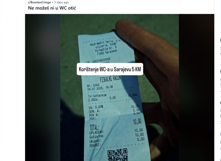 Jedan primjer posebno je zapalio društvene mreže: korisnik Reddita podijelio je fotografiju računa iz jedne picerije u Sarajevu, gdje mu je – pored hrane – naplaćena i upotreba toaleta. Cijena? Ni manje ni više nego 5 konvertibilnih maraka za toalet.