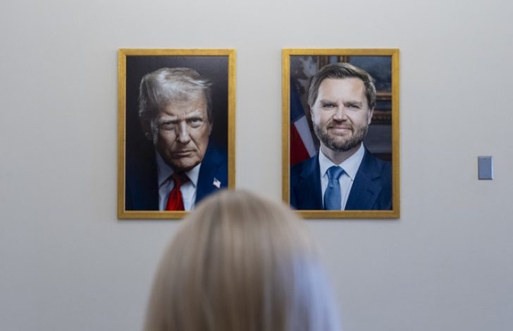 Zvanični portret iz prvog Trampovog mandata prikazuje ga kako se široko osmjehuje ispred američke zastave i nosi plavu kravatu.