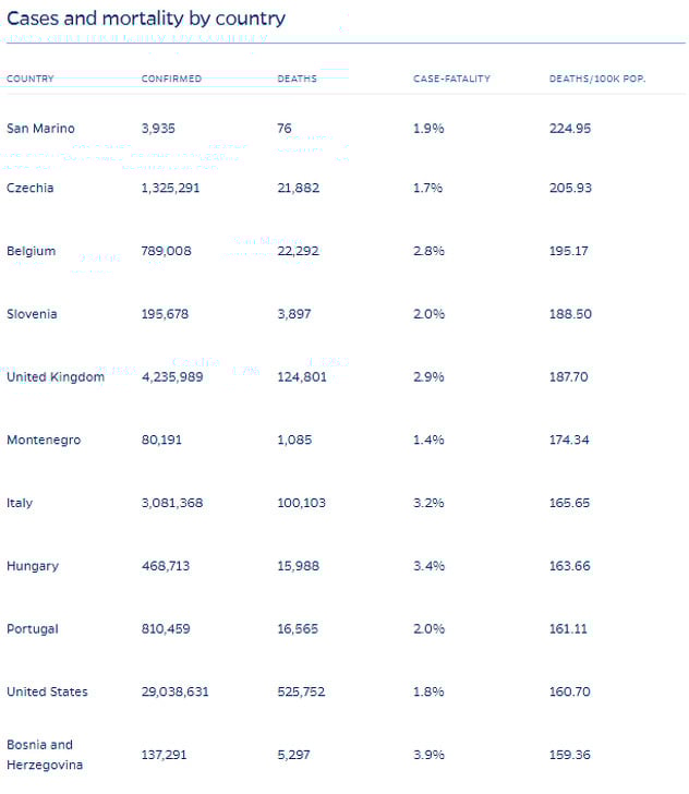 Na samom vrhu ove liste je San Marino (224 preminulih na 100.000 stanovnika), a slijede Češka (205), Belgija (195), Slovenija (188), Velika Britanija (187), Crna Gora (174), Italija (165), Mađarska (161), Portugal (161) i SAD (160).
