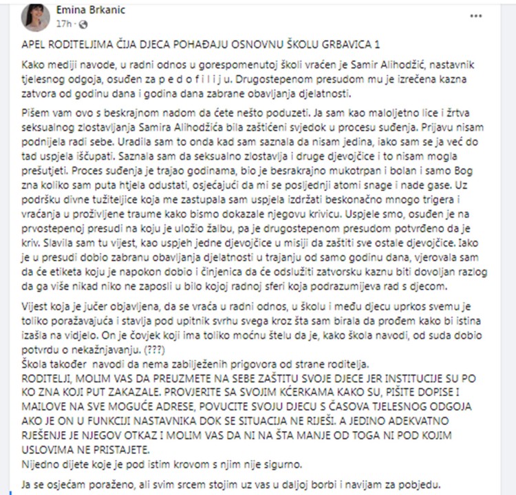 Ova vijest je uznemirila i Eminu Brkanić koja je, kako prenosi pomenuti medij, prije sedam godina bila učenica OŠ Grbavica 1 u Sarajevu i žrtva pedofila-nastavnika Samira Alihodžića.