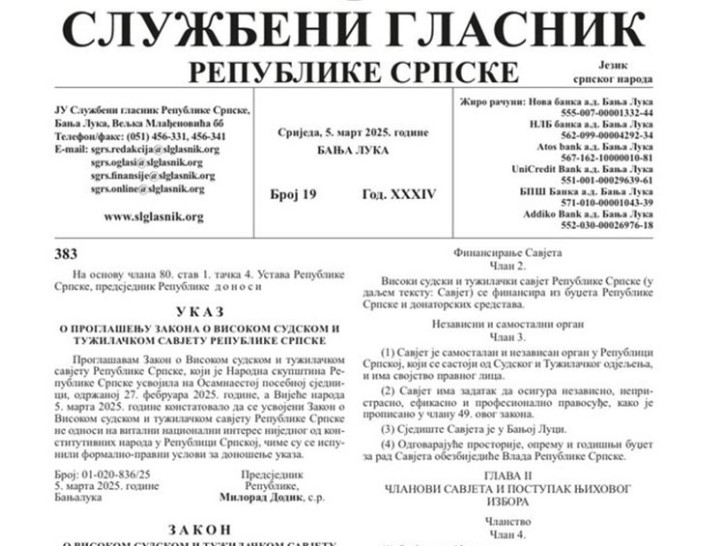 Ukaze o proglašenju ovih zakona sinoć je potpisao predsjednik Republike Srpske Milorad Dodik, a oni su potom objavljeni u "Službenom glasniku Republike Srpske".