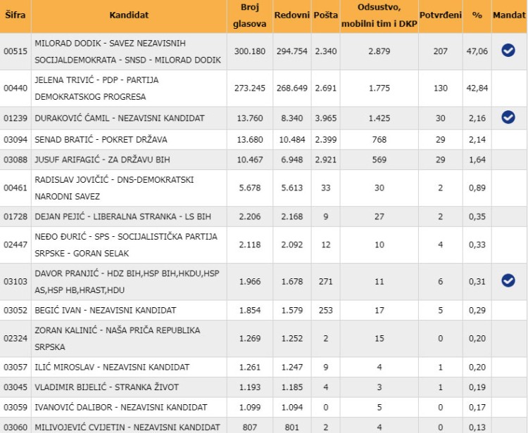 Prema tim rezultatima, Milorad Dodik, kandidat SNSD-a, osvojio je 300.180 glasova (47,06 odsto), dok je Jelena Trivić, kandidat PDP-a, osvojila 273.245 glasova (42,84 odsto).