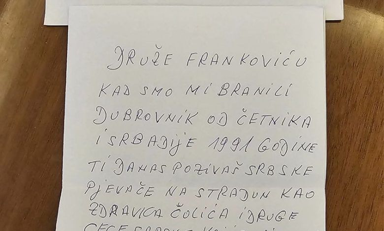 Između ostaloga u pismu se navodi: – Kad smo mi branili Dubrovnik od četnika i srbadije 1991. godine, a ti danas pozivaš srpske pjevače na Stradun kao Zdravka Čolića i druge… –