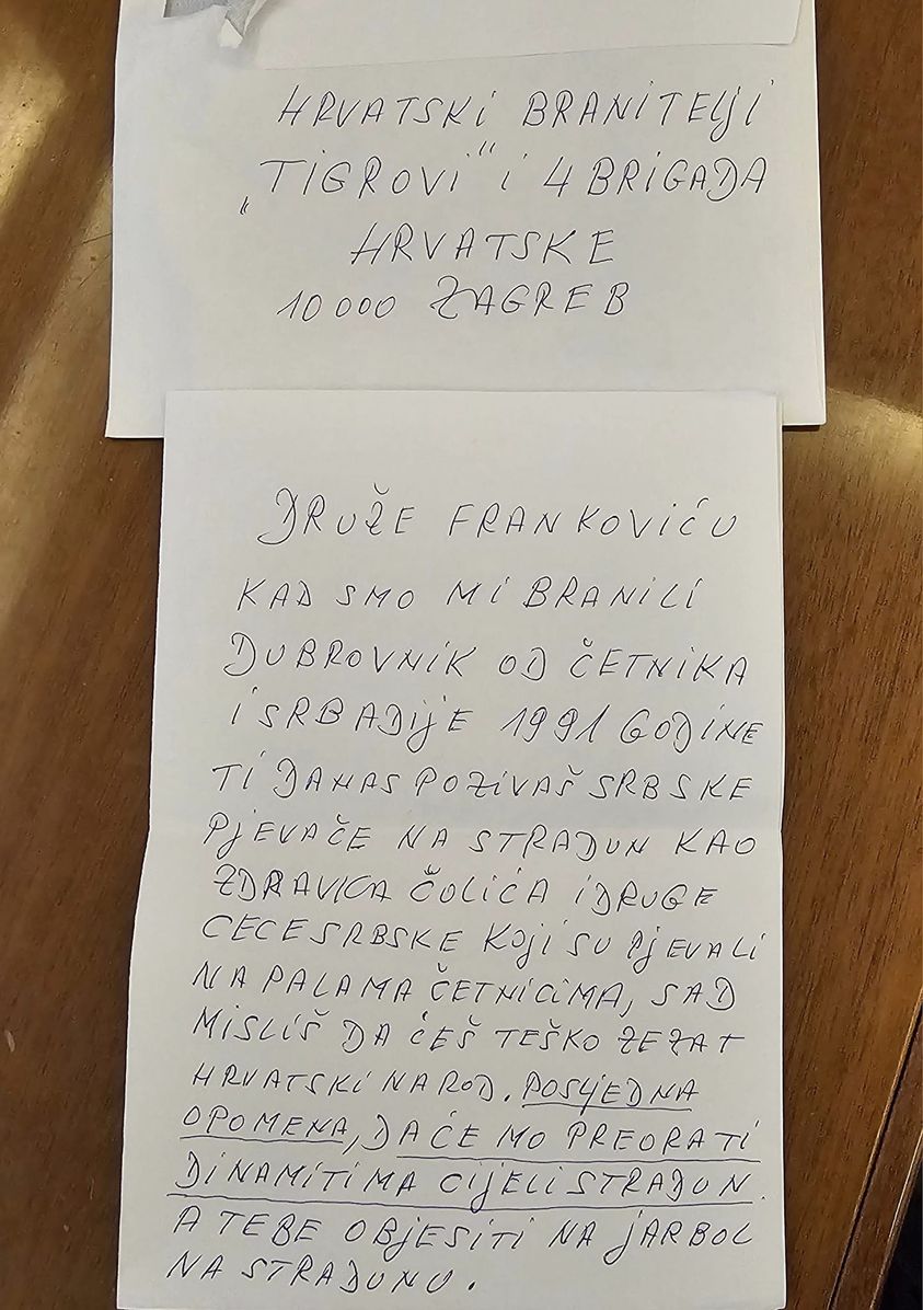 Dubrovački gradonačelnik Mato Franković objavio je pismo u kojem mu se prijeti. Navedeno je da su pismo poslali hrvatski branitelji Tigrovi i 4. brigada Hrvatske.