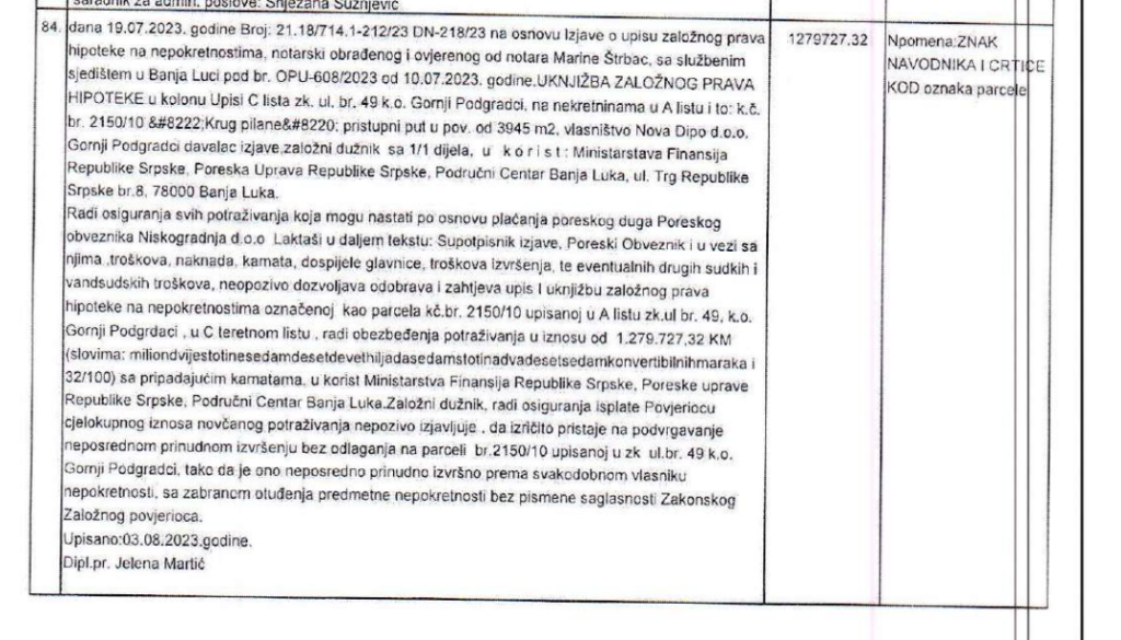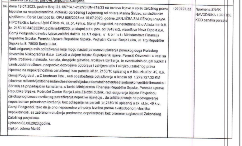 U njoj se kao nosilac založnog prava navodi Ministarstvo finansija Republike Srpske, a koje se upisalo kako bi zaštitilo svoje potraživanje, odnosno dug koji Ćubić ima prema Poreskoj upravi od 1,27 miliona KM.