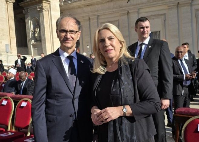 Predsjedavajuća Predsjedništva Bosne i Hercegovine Željka Cvijanović i predsjednik Vlade Republike Srbije Đuro Macut susreli su se danas u Vatikanu, gdje borave povodom sahrane pape Franje.