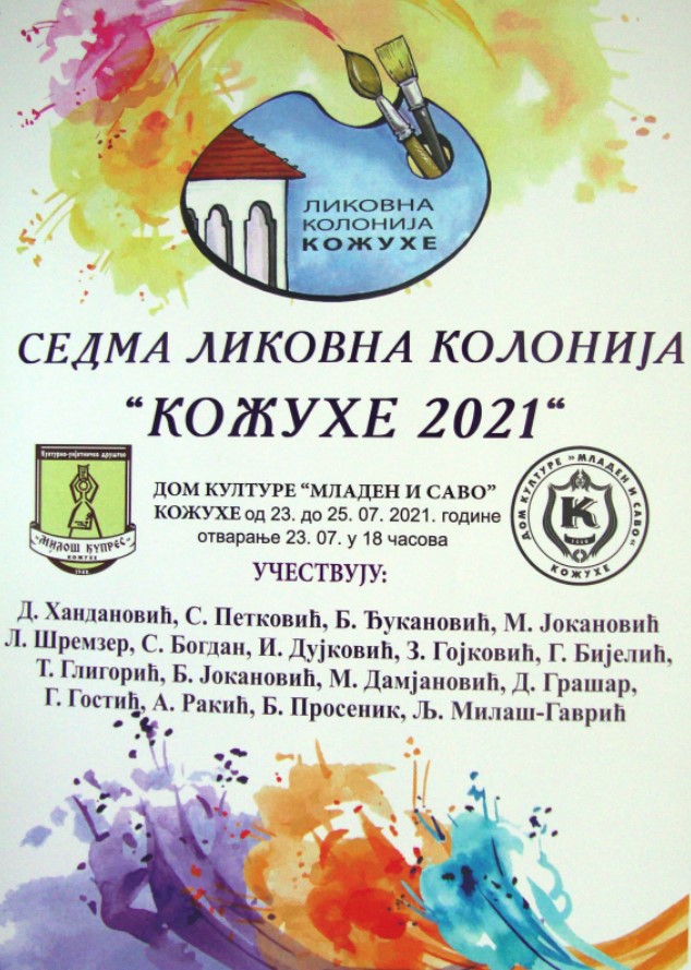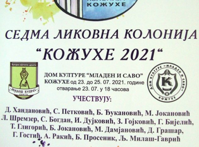 U organizaciji kožuškog Kulturno-umjetničkog društva „Miloš Kupres” danas sa početkom u 18 časova biće otvorena Sedma likovna kolonija „Kožuhe 2021”. Likovna kolonija će biti održana u Domu kulture „Mladen i Savo” od 23. do 25. jula.