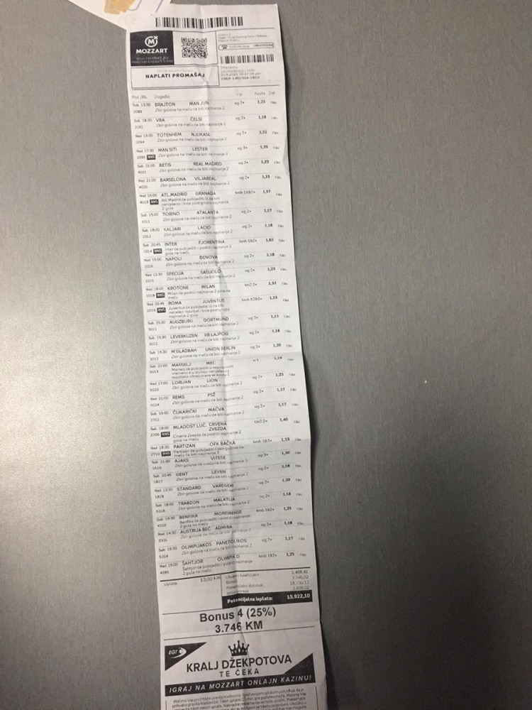Ukupna pogođena kvota je 1498,41 i na uplatu od 10 KM, dobitak iznosi 14.984,10 KM. Na taj iznos, kladionica MOZZART je dodala bonus u iznosu od 3.746,02 KM na dužinu tiketa, što znači da je ukupni dobitak 18.730,12 KM.