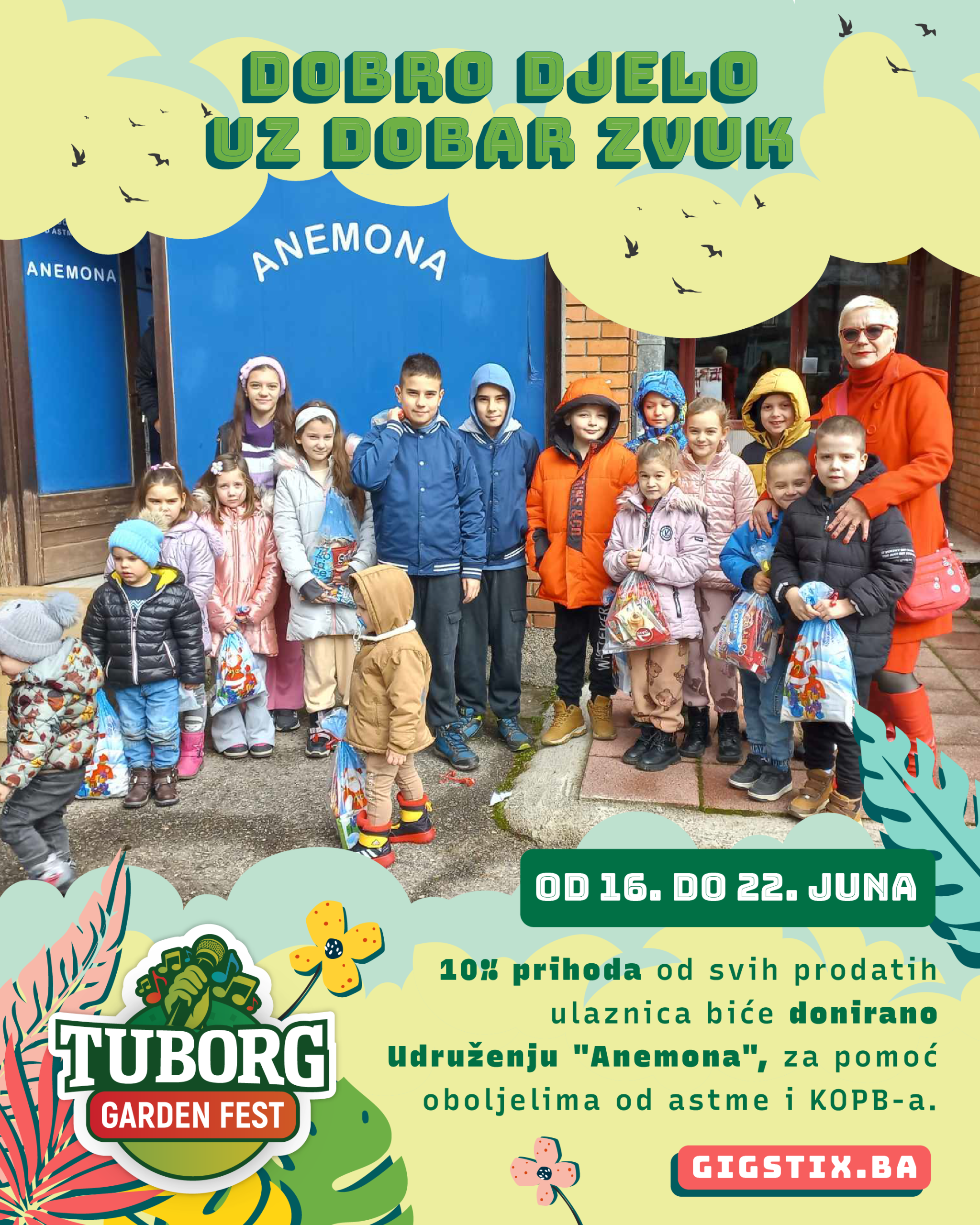 Naime, „Tuborg Garden Fest“  će 10% prihoda od svih prodatih ulaznica donirati Udruženju „Anemona“ iz Prijedora za pomoć oboljelim od astme i hronične opstruktivne bolesti pluća. Kupite svoje karte već danas, budite humani i obezbjedite svoje mjesto u Ljetnoj bašti Prijedor.