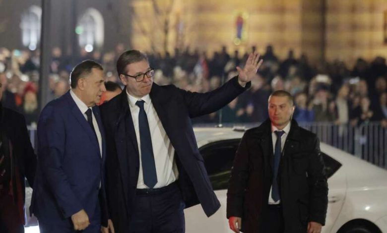 Predsjednik Srbije Aleksandar Vučić i predsjednik Republike Srpske Milorad Dodik obratili su se večeras okupljenim građanima u Banjaluci, neposredno prije sastanka u Palati Republike.
