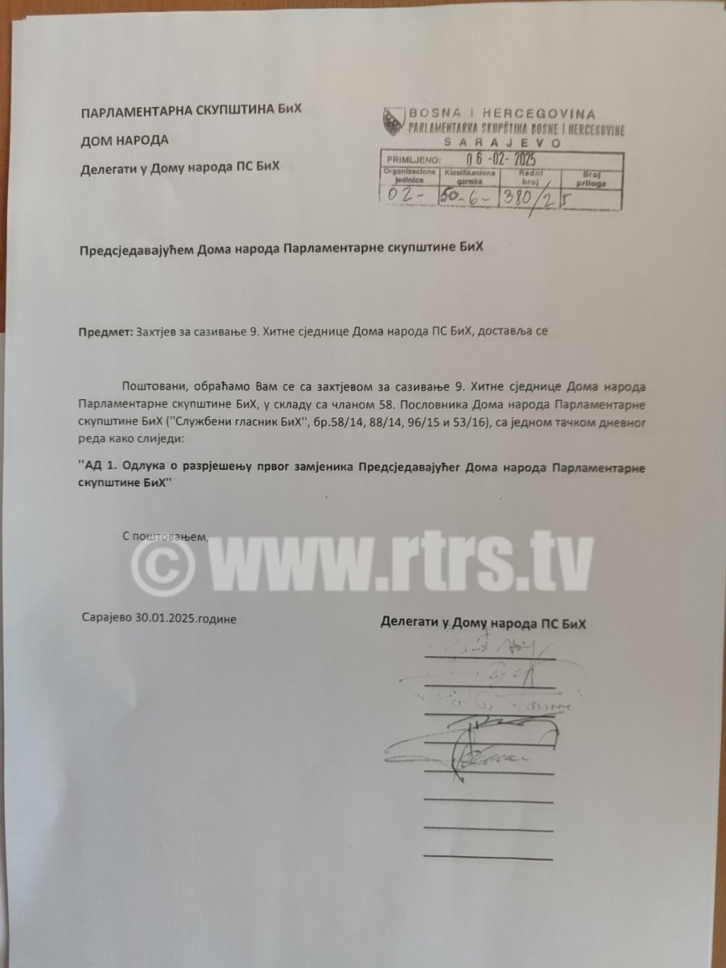 Zahtjev je potpisalo pet delegata – Želimir Nešković iz SDS-a, Nenad Vuković iz PDP-a, Ilija Cvitanović iz HDZ 1990, Kemal Ademović iz NiP-a i Zlatko Miletić, delegat Kluba Hrvata -“Za nove generacije”.