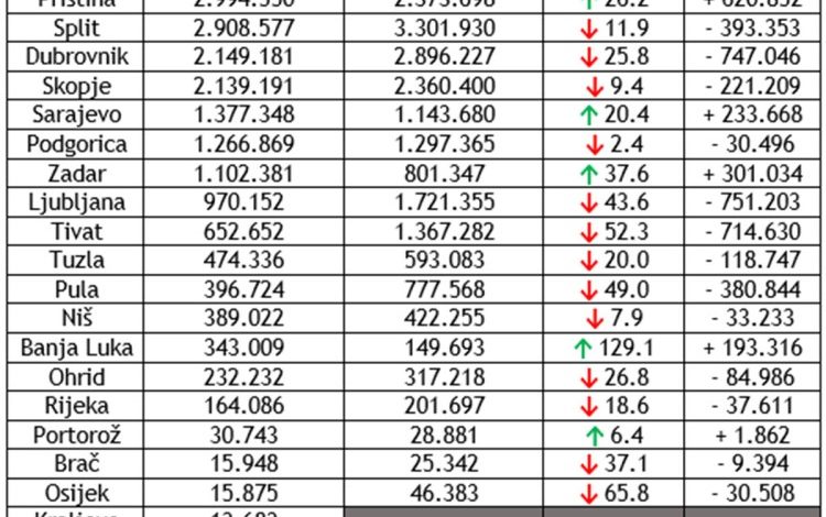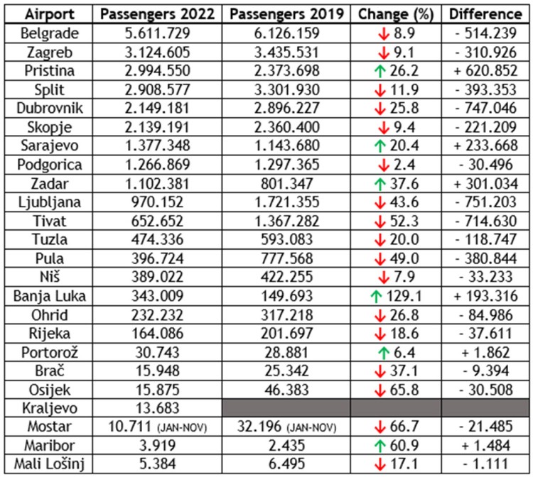 Posmatrano u apsolutnim brojkama, Aerodrom Priština je zabilježio najveće poboljšanje u odnosu na performanse prije pandemije, dodavši preko 600.000 putnika. Slijedio ga je Zadar, koji je u jednoj godini prevezao preko milion putnika, odnosno oko 300.000 više. Dobrim rezultatima može se pohvaliti i Međunarodni aerodrom Sarajevo, koji je lani imao 1.377.348 putnika, ili za 233 hiljade više nego 2019. godine.