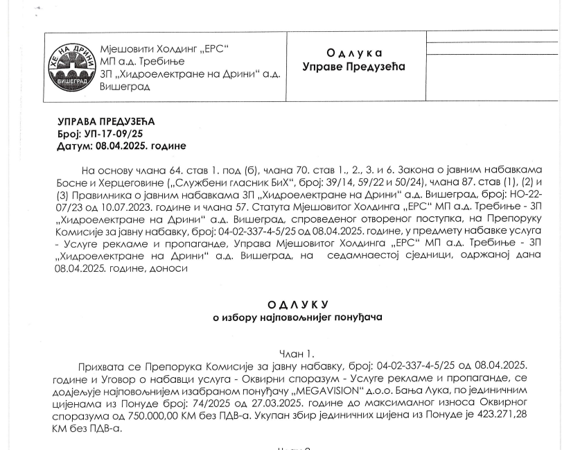 Preduzeće „Hidroelektrane na Drini“ iz Višegrada platiće firmi „Megavision“ iz Banjaluke pola miliona maraka za usluge reklame i marketinga do kraja ove godine.