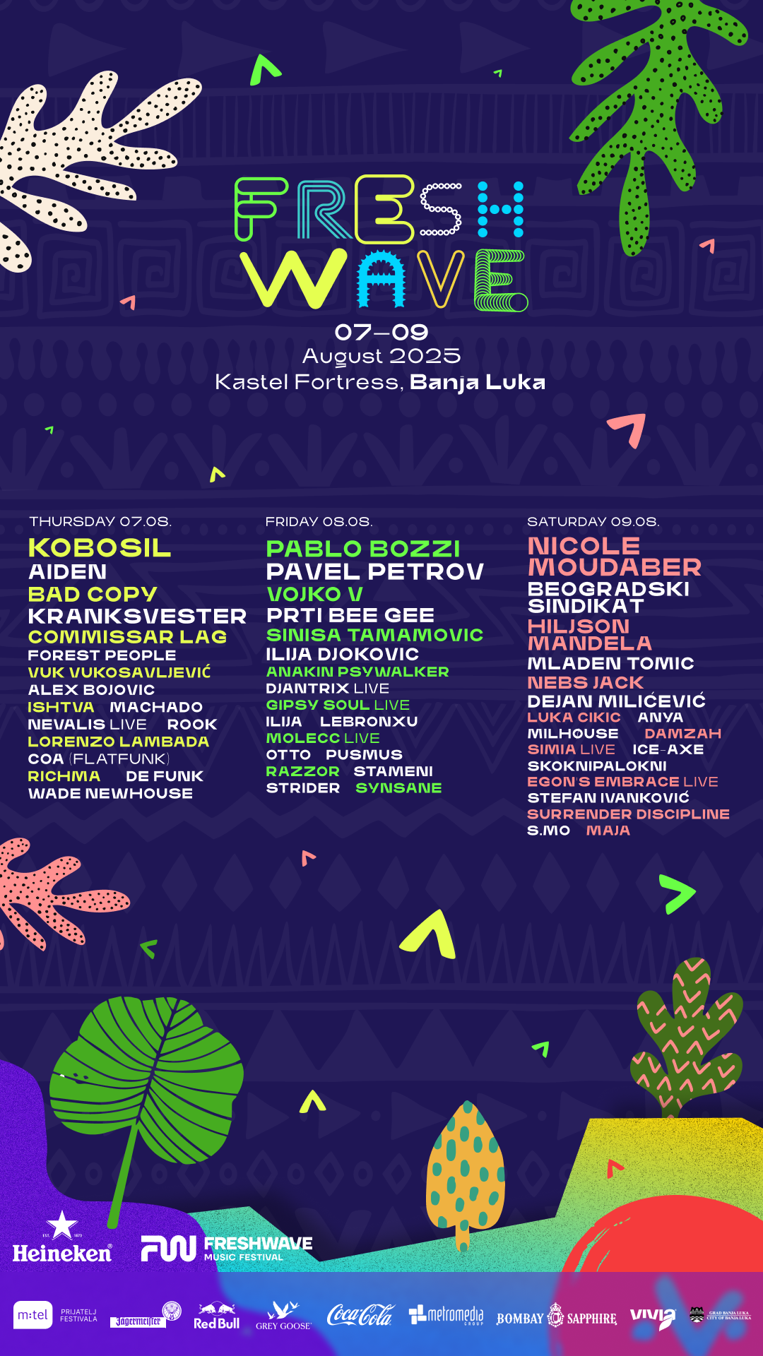 "Freshwave" festival, koji se od 7. do 9. avgusta održava na tvrđavi Kastel u Banjaluci, predstavio je konačni program i još jednom potvrdio svoj status najvećeg regionalnog festivalskog događaja ovog ljeta. Sa preko pedeset izvođača raspoređenih na pet jedinstvenih festivalskih bina, "Freshwave" će okupiti imena koja predstavljaju sam vrh globalne elektronske scene, ali i regionalne hip-hop legende, obećavajući tri nezaboravna festivalska dana ispunjena vrhunskom muzikom, adrenalinom i atmosferom koja se pamti.
