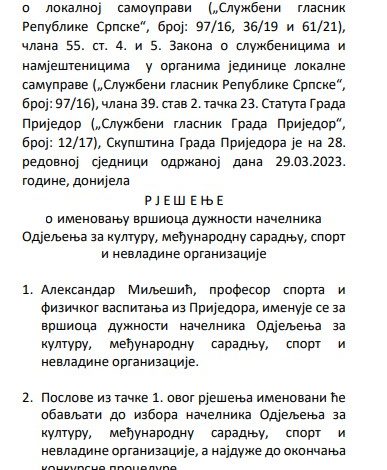 Međutim, krajem marta ove godine Skupština grada Prijedora izabrala ga je za vršioca dužnosti načelnika Odjeljenja za kulturu, međunarodnu saradnju, sport i nevladine organizacije.