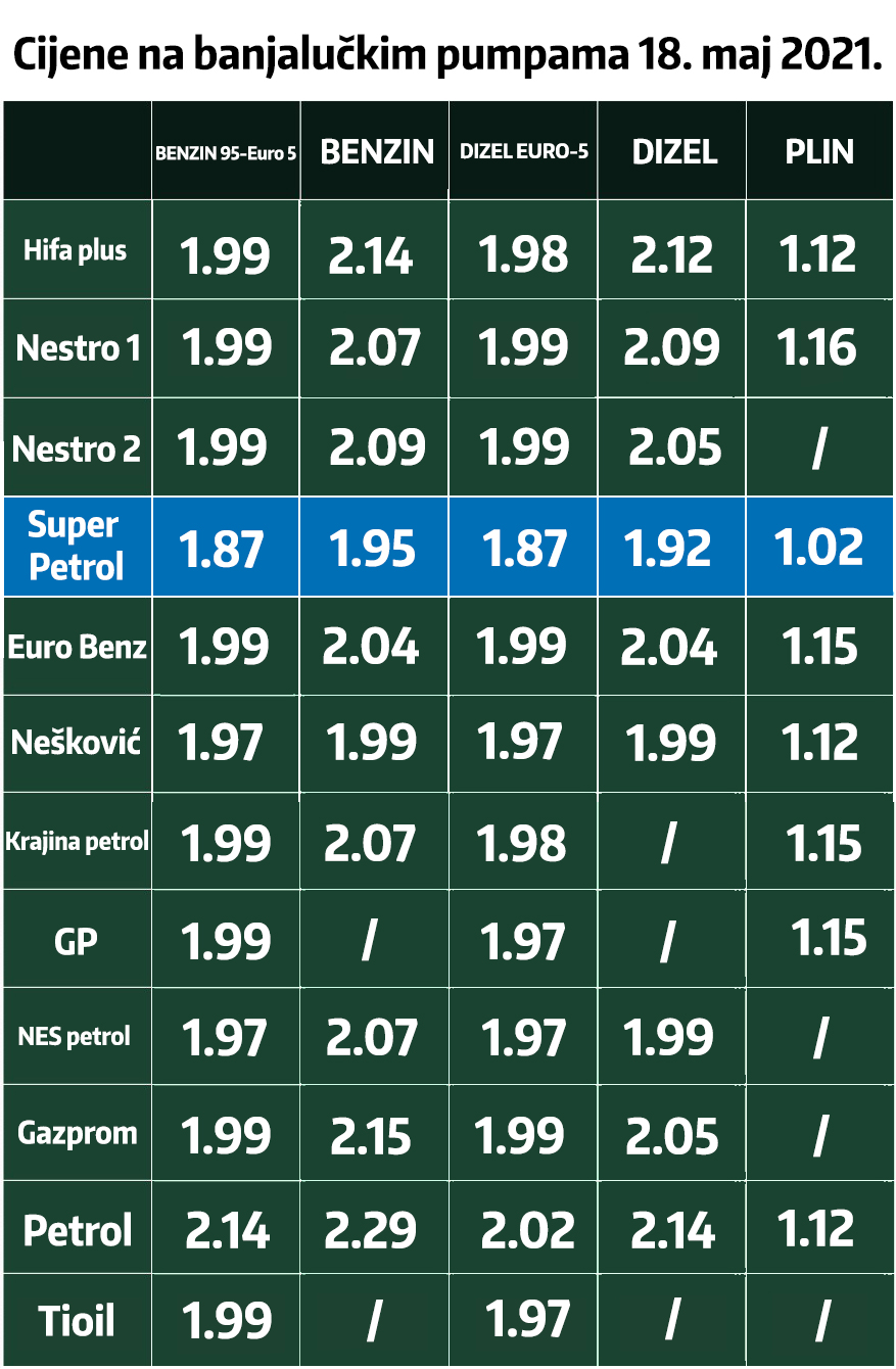 U tabeli i na fotografijama možete vidjeti gdje je kolika cijena, kao i gdje je najjeftinije gorivo u Banjaluci.