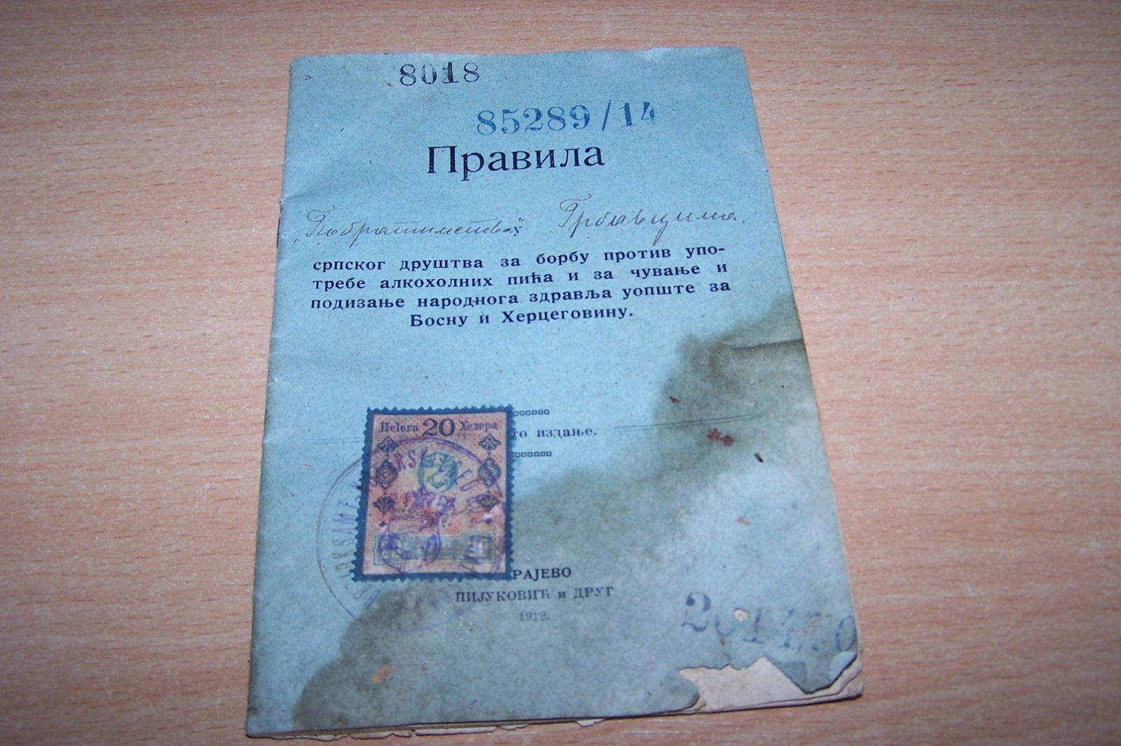 Inače Pobratimstvo srpskog društva za borbu protiv upotrebe alkoholnih pića i za čuvanje i podizanje narodnog zdravlja uopšte za Bosnu i Hercegovinu., formirano je 1912. godine u Srajevu, što potvrđuje i datum sa knjižice „Pravila“.