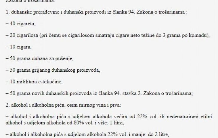 Do 200 cigareta , Do 250 grama duvana za pušenje , 1 litar alkoholnog pića s udjelom alkohola višim od 22 posto, 2 litra alkoholnog pića s učešćem alkohola 22 posto i manje , 4 litra vina , 6 litara piva.