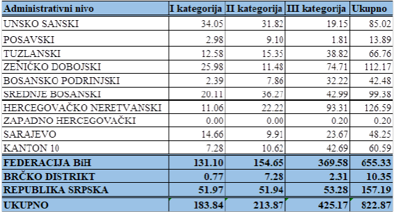 Nivo zagađenosti varira po regionima: Federacija BiH ima oko 661 km² preostalog sumnjivog područja, Republika Srpska oko 168 km², a Brčko Distrikt oko 9,5 km² U Federaciji su posebno pogođeni kantoni sa najvećim preostalim minskim površinama – npr. Hercegovačko-neretvanski kanton (~127 km²), Srednjobosanski (~101 km²) i Zeničko-dobojski (~109 km²) – svaki od njih sadrži desetine kvadratnih kilometara sumnjive površine Ovakva rasprostranjenost mina znači da su kontaminirane stotine lokacija širom zemlje, najviše u ruralnim i brdskim predjelima gdje su vođene borbe. Prema podacima Centra za uklanjanje mina BiH, problem mina direktno utiče na preko 538.000 ljudi u više od 1.400 zajednica (oko 15% stanovništva) što oslikava razmjere ugroženosti stanovništva u zahvaćenim regijama.