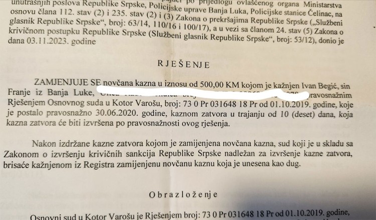 – I zatvor je za ljude. Ljude koji nisu u sistemu vlasti. Vidimo se za 10 dana – napisao je Begić, uz priloženu fotografiju na kojoj se vidi rješenje Osnovnog suda u Kotor Varošu od 3. novembra 2023, a u kome piše da se ranija kazna od 500 KM zamjenjuje zatvorskom u trajanju od deset dana.