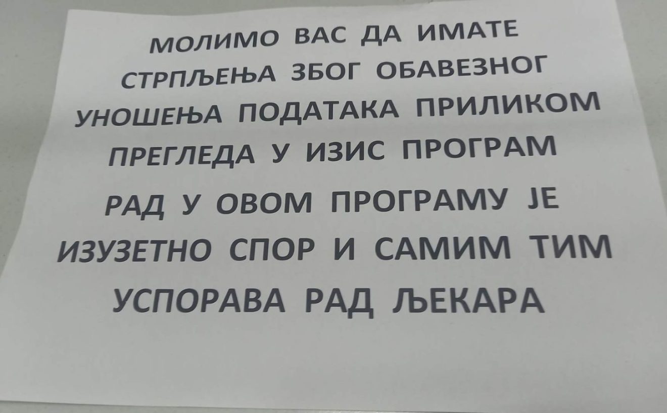 – Molimo vas da imate strpljenja zbog obaveznog unošenja podataka prilikom pregleda u IZIS program. Rad u ovom program je izuzetno spor i samim tim usporava rad ljekara – navedeno je u obavještenju za koje pacijenti tvrde da se nalazilo u Domu zdravlja Kozarska Dubica.