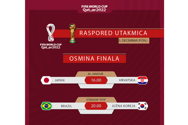Svjetsko prvenstvo u fudbalu ušlo je u 16. dan tokom kojeg će se igrati dvije utakmice osmine finala. Japan i Hrvatska sastaju se od 16 časova, a Brazil protiv Južne Koreje igra od 20 časova.