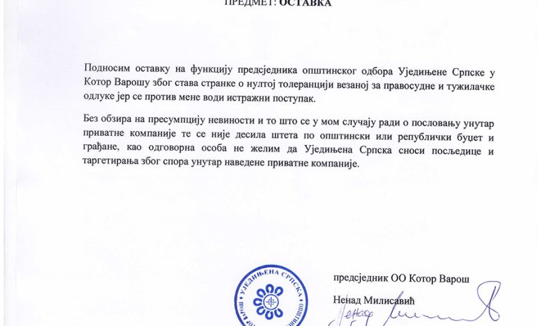 Predsjednik Opštinskog odbora Ujedinjene Srpske Kotor Varoš, Nenad Milisavić, podnio je ostavku na tu funkciju.