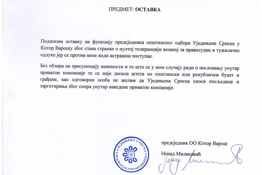 – Bez obzira na presumciju nevinosti i to što se u mom slučaju radi o poslovanju unutar privatne kompanije te se nije desila šteta po opštinski ili republički buidžet i građane, kao odgovorna osoba ne želim da Ujedinjena Srpska snosi posljedice i targetiranja zbog spora unutar navedene privatne komopanije – naveo je Milisavić.