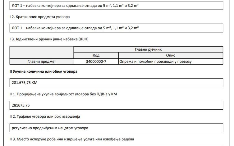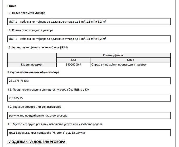 Tako je, na primjer, u Obavještenju o dodjeli ugovora za nabavku kontejnera i kanti za odlaganje otpada, koji je Grad Banjaluka 17. jula ove godine sklopio sa “Procesnom opremom inženjering” d.o.o. Laktaši, cijena kupoprodajnog ugovora iznosila 281.675,75 KM (Dokument – Ugovor 281.675 KM).