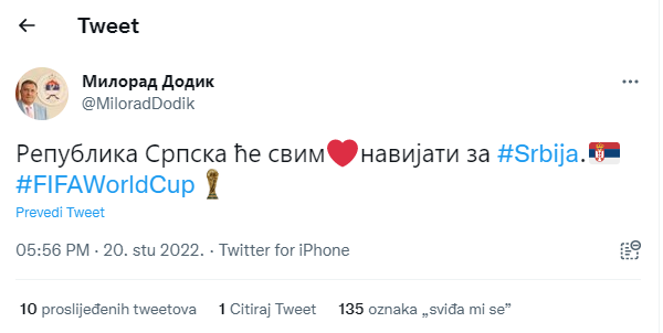 Predsjednik Republike Srpske Milorad Dodik istakao je da će Republika Srpska navijati za Srbiju na Svjetskom fudbalskom prvenstvu, koje je danas počelo u Kataru.
