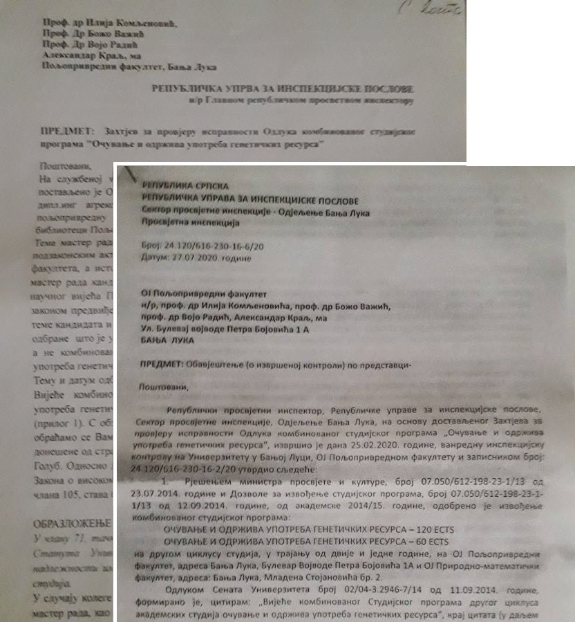 U odgovoru, odnosno obavještenju o izvršenoj inspekcijskoj kontroli koji je 27. jula ove godine, Republička uprava za inspekcijske poslove dostavila pošiljaocima dopisa i upravi Poljoprivrednog fakultetu u Banjaluci (a koja je takođe u posjedu naše redakcije), praktično su potvrđeni svi navodi četvorice profesora, koji su se pobunili i zatražili rasvjetljavanje ovog slučaja.