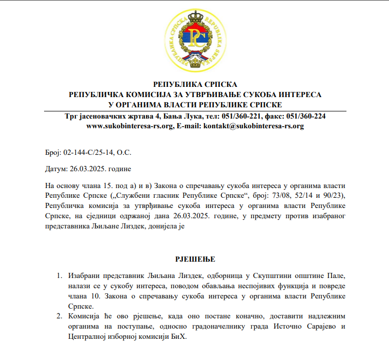 Republička komisija za utvrđivanje sukoba interesa u organima vlasti Republike Srpske utvrdila je da je Ljiljana Lizdek (SNSD) mjesecima unazad u sukobu interesa s obzirom na to da istovremeno obavlja funkciju načelnika Odjeljenja za privredu i društvene djelatnosti grada Istočno Sarajevo i odbornika u Skupštini opštine Pale.