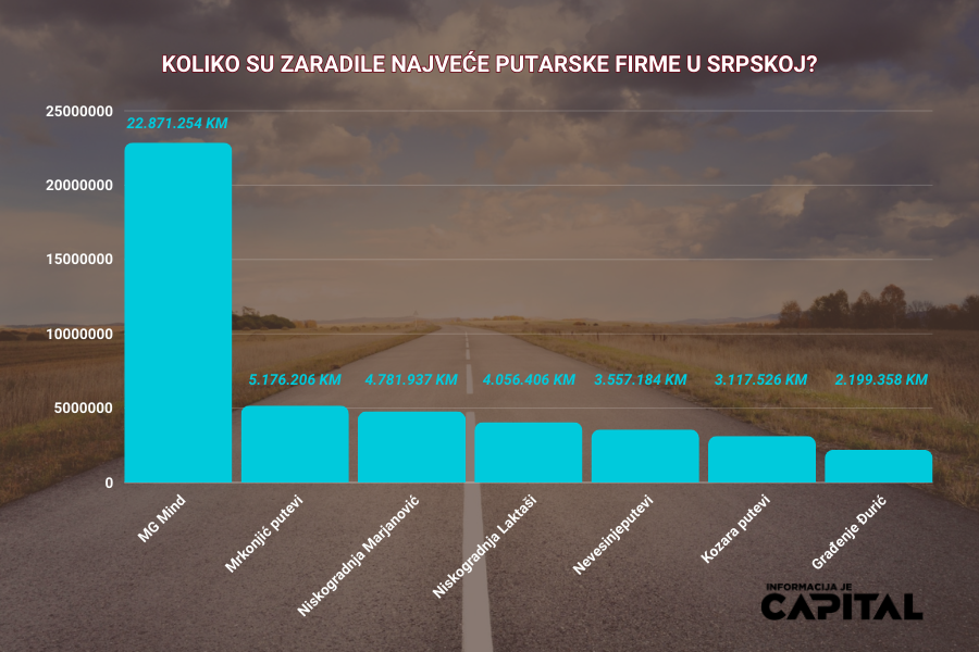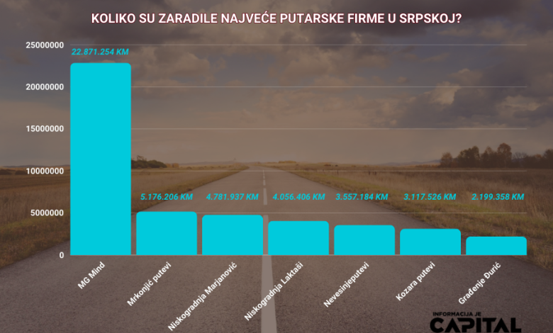 Najveće putarske firme u Republici Srpskoj obrnule su prošle godine oko 287 miliona maraka, a najveći prihod od 89,8 miliona KM svakako je imalo preduzeće „MG mind“, saznaje CAPITAL.