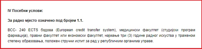 Prema uslovima novog konkursa, direktor Republičkog inspektorata može da bude i lice sa završenim Medicinskim fakultetom, ali samo smjer – farmacija. Upravo onaj koji je završila aktuelna v.d. direktorica Danijela Batar.
