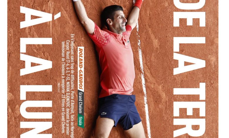 "De La Terre, A La Lunne", u prevodu "Sa zemlje na mjesec" piše na naslovnoj strani uz ogromnu Đokovićevu fotografiju koji leži na pariskoj šljaci nakon osvajanja Rolan Garosa.