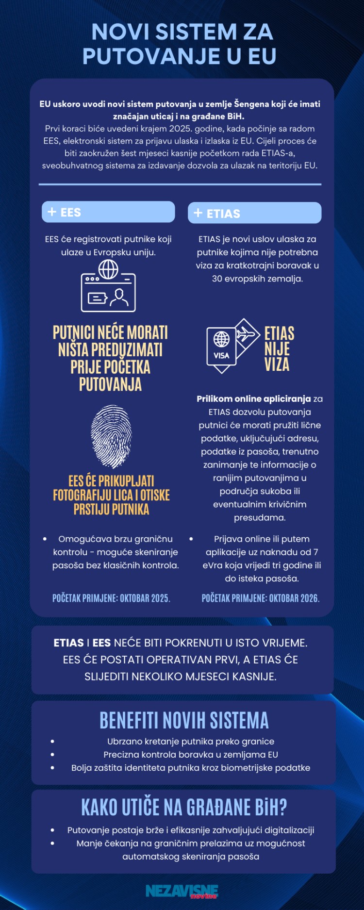 Evropska unija uvodi značajne promjene u sistemu putovanja u zemlje šengenskog prostora, koje će imati direktan uticaj i na građane Bosne i Hercegovine. Novi sistemi koji su najavljeni, Entry/Exit System (EES) i European Travel Information and Authorisation System (ETIAS), modernizovaće i ubrzati prelazak granica.
