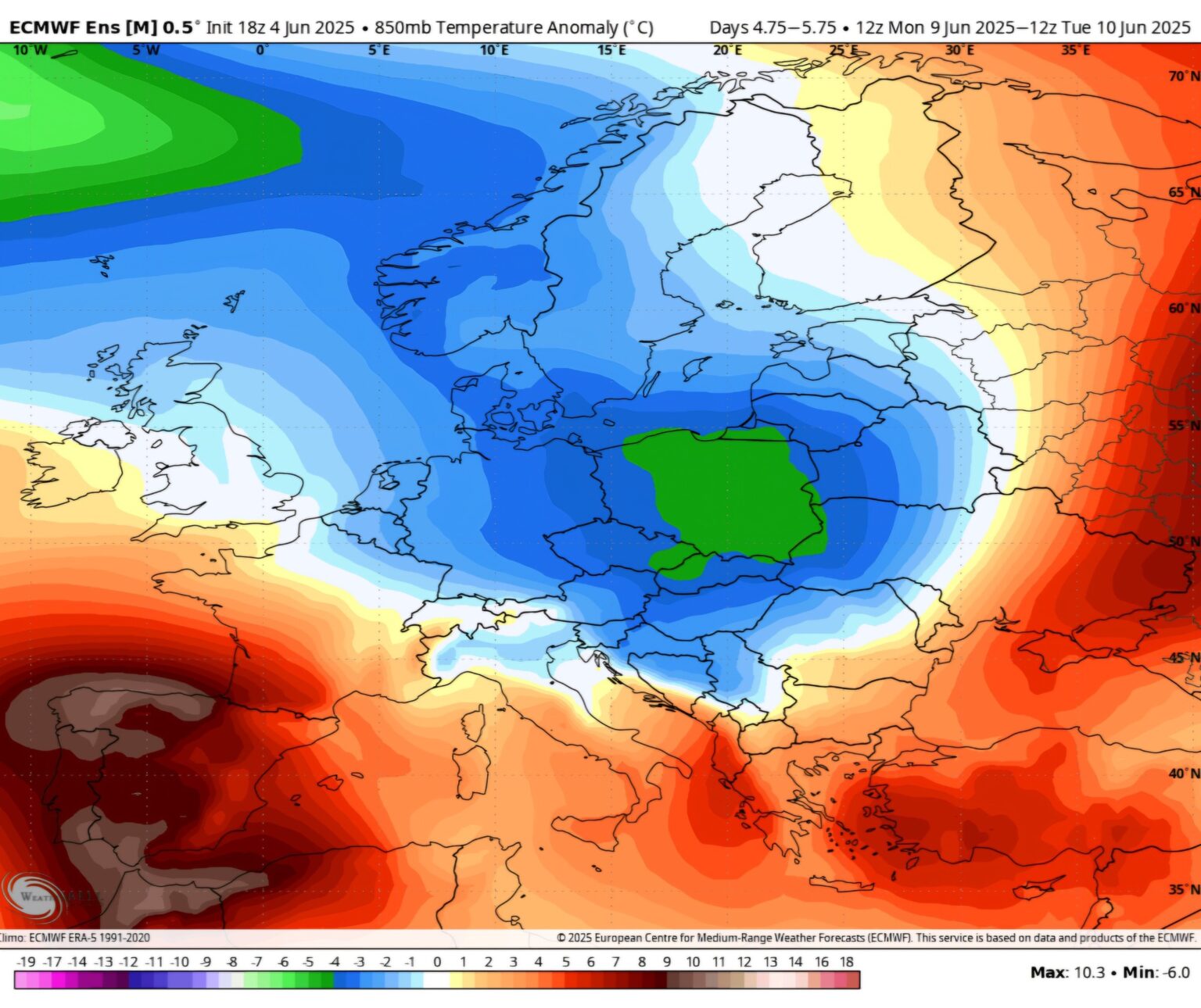 Na karti je vidiljivo odstupanje temperatura od prosjeka u ponedjeljak, što ukazuje na osvježenje taj dan. Zahlađenje će se najmanje osjtiti na jugu Hercegovine uz gotovo neprimjetan pad temperatura, ali uz fensku buru taj dan.