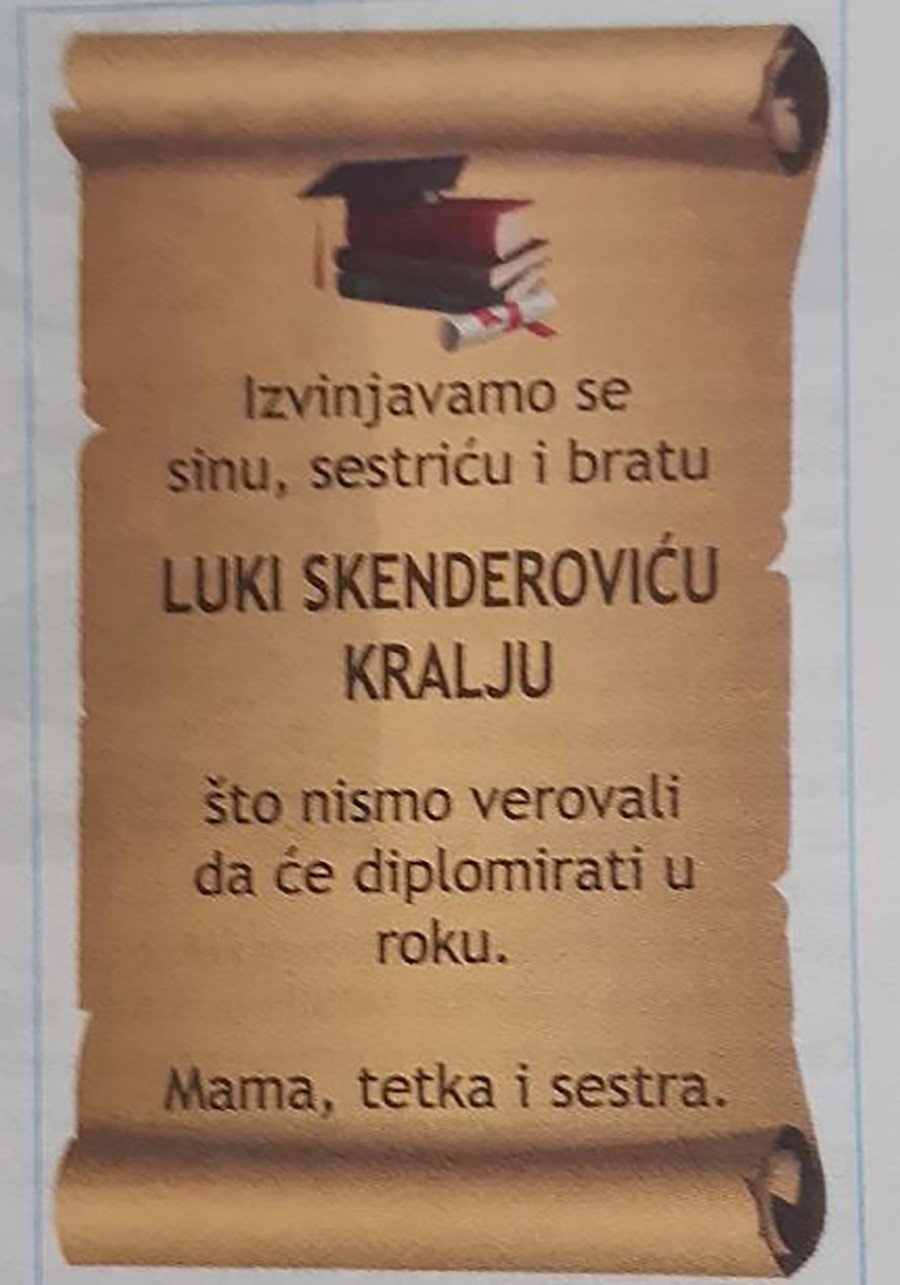 – Izvinjavamo se sinu, sestriću i bratu Luki Skenderoviću, kralju, što nismo vjerovali da će diplomirati u roku – poručile su majka, tetka i sestra.