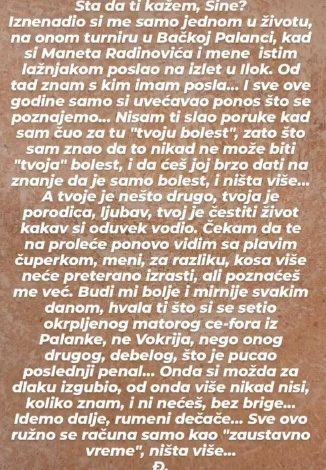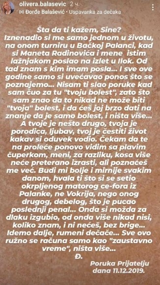 – Šta da ti kažem, sine? Iznenadio si me samo jednom u životu, na onom turniru u Bačkoj Palanci, kad si Maneta Radinovića i mene istim lažnjakom poslao na izlet u Ilok. Od tad znam s kim imam posla… I sve ove godine samo si uvećavao ponos što se poznajemo. Nisam ti slao poruke kad sam čuo za tu ‘tvoju bolest’, zato što sam znao da to ne može biti ‘tvoja’ bolest i da ćeš joj brzo dati na znanje da je samo bolest i ništa više… A tvoje je nešto drugo, tvoja je porodica, ljubav, tvoj je čestiti život kakav si oduvijek vodio. Čekam da te na proljeće vidim s plavim čuperkom, meni, za razliku, kosa više neće pretjerano izrasti, ali prepoznat ćeš me. Budi mi bolje i mirnije svakim danom, hvala ti što si se sjetio okrpljenog starog ce-fora iz Palanke, ne Vokrija, nego onog drugog, debelog, što je pucao posljednji penal. Onda si možda za dlaku izgubio, od onda više nikad nisi, koliko znam, ni nećeš, bez brige. Idemo dalje, rumeni dječače… Sve ovo ružno se računa samo kao ‘zaustavno vrijeme’, ništa više. Đ. – stoji u poruci koju je Olivera Balašević objavila na društvenoj mreži Instagram.