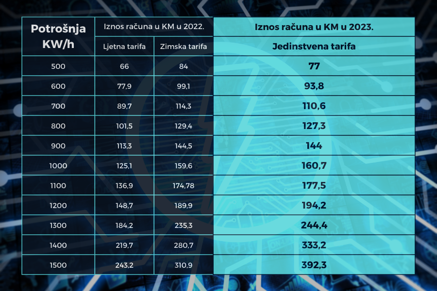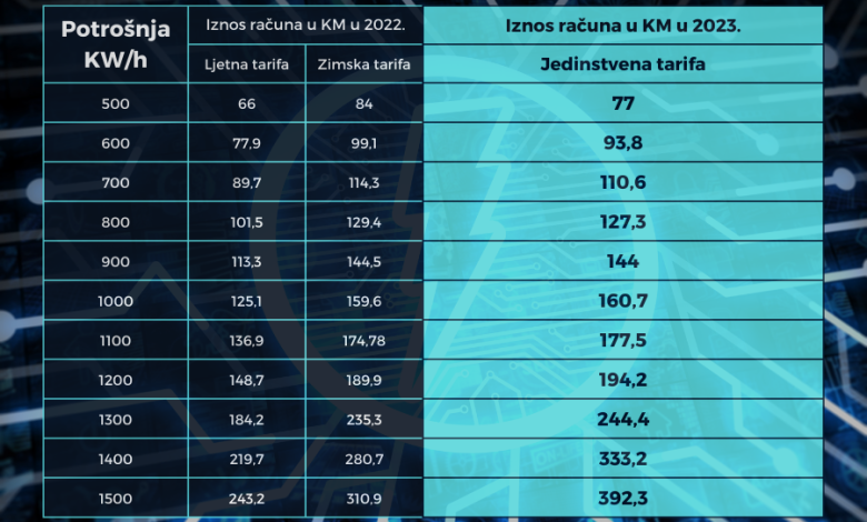 Ukoliko bi se gledala prosječna cijena ljetne i zimske tarife to bi značilo da će računi za potrošenih 500 kilovata iduće godine biti veći za dvije KM.