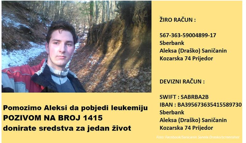 Osam mjeseci nakon transplantacije koštane srži, dvadesetjednogodišnjem Aleksi Saničaninu iz Prijedora, stanje se pogoršalo. Ovaj mladić obolio je od limfoblastne leukemije i potrebna mu je naša pomoć.