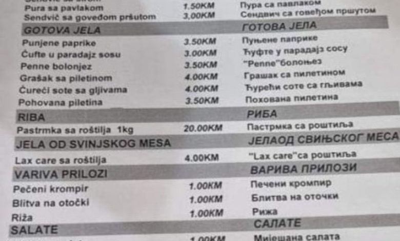 Najskuplje jelo na meniju je pastrmka sa cijenom od 20 KM, ali za kilogram ribe.