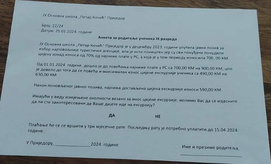 – Od 1. januara 2024. godine došlo je do povećanja najniže plate u Republici Srpskoj sa 700 KM na 900 KM što je dovelo do toga da se poveća i maksimalan iznos cijene ekskurzije učenika sa 490 KM na 630 KM. Nakon ponovljenog javnog poziva, najniža dostavljena cijena ekskurzije iznosi 590 KM – objašnjeno je u okviru ankete za roditelje kojom u školi žele potvrditi da li roditelji ostaju pri odluci da njihovo dijete ide na ekskurziju po novim uslovima.