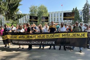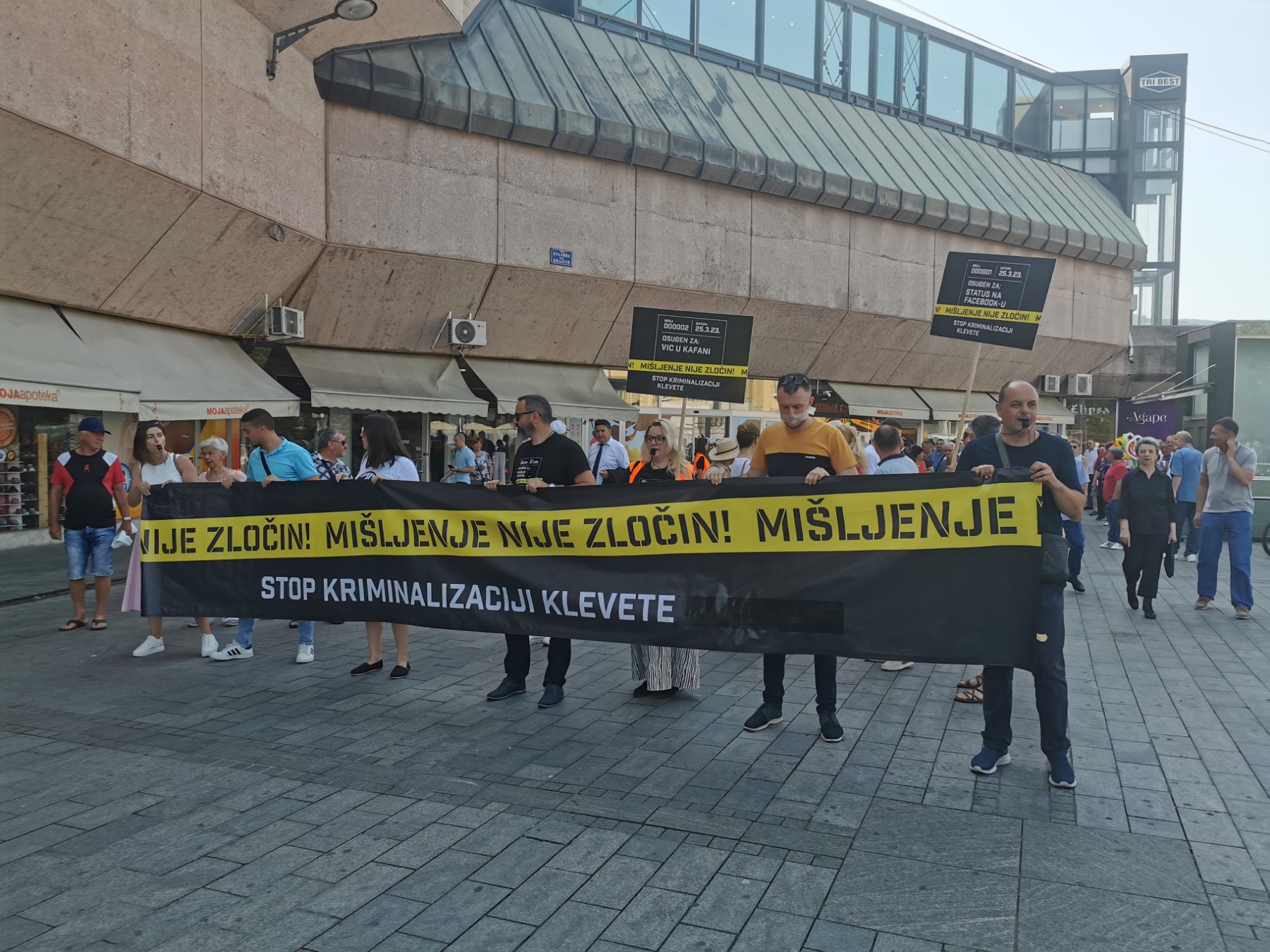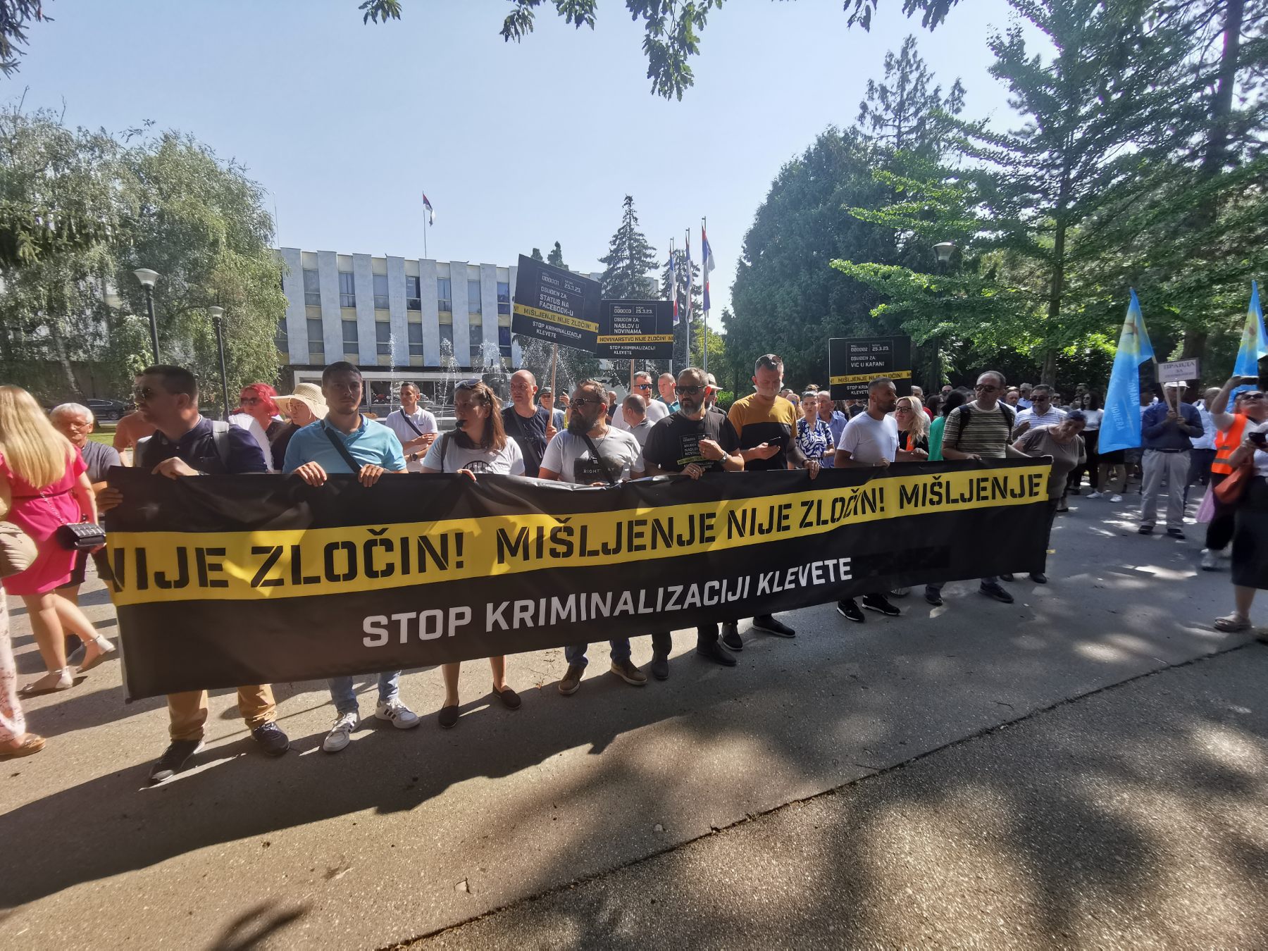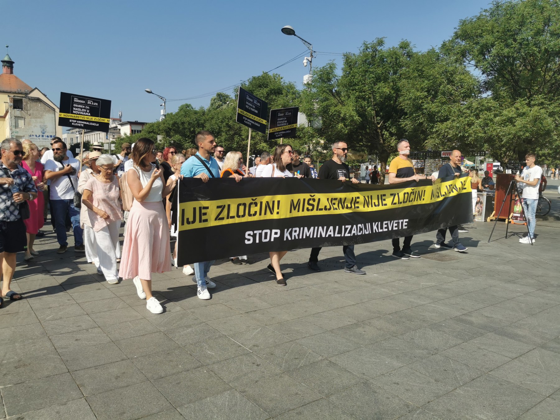 Novinari, predstavnici civilnog društva i brojni građani održali su jutros protest kod megafona na Trgu Krajine i prošetali do Narodne skupštine Republike Srpske zahtijevajući od poslanika da odbace kriminalizaciju klevete, ali su oni to odbacili već na početku zasjedanja.