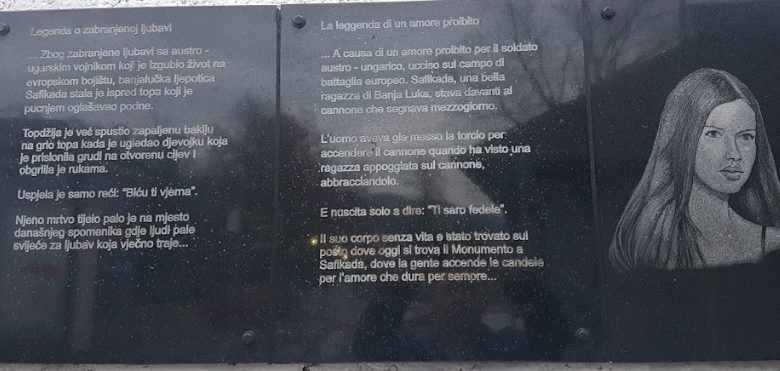 Iako je njihova sreća od početka bila osuđena na propast, jer su joj, kao i drugim djevojkama tog doba roditelji određivali muža, mladi par zakleo se na vječnu ljubav i odlučio na bijeg. Planovi su im poremećeni iznenadnom naredbom o pokretu austro-ugarske vojske, a nakon što je do Banjaluke došla vijest o njegovoj pogibiji na ratištu, Safikada je od tuge sama sebi oduzela život. U najljepšem svadbenom ruhu stala je pred top čiji je pucanj svaki dan označavao podne sa zidina Kastela, i tako održala svoje obećanje o vječnoj ljubavi i vjernosti.