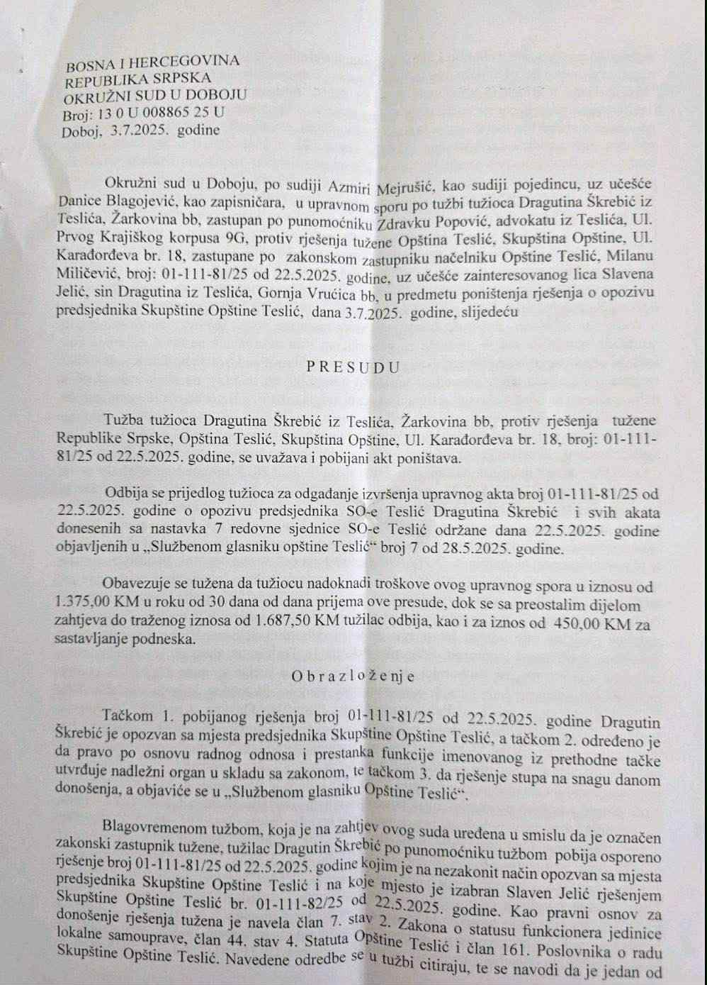 Okružni sud u Doboju poništio je rješenja o opozivu predsjednika i potpredsjednika Skupštine grada Teslić Dragutina Škrebića i Veljka Јotanovića, koja je nakon prekinute sjednice 22. maja usvojila nova skupštinska većina okupljena oko SDS-a kojima se priključio odbornik SDA Meša Јašarević.
